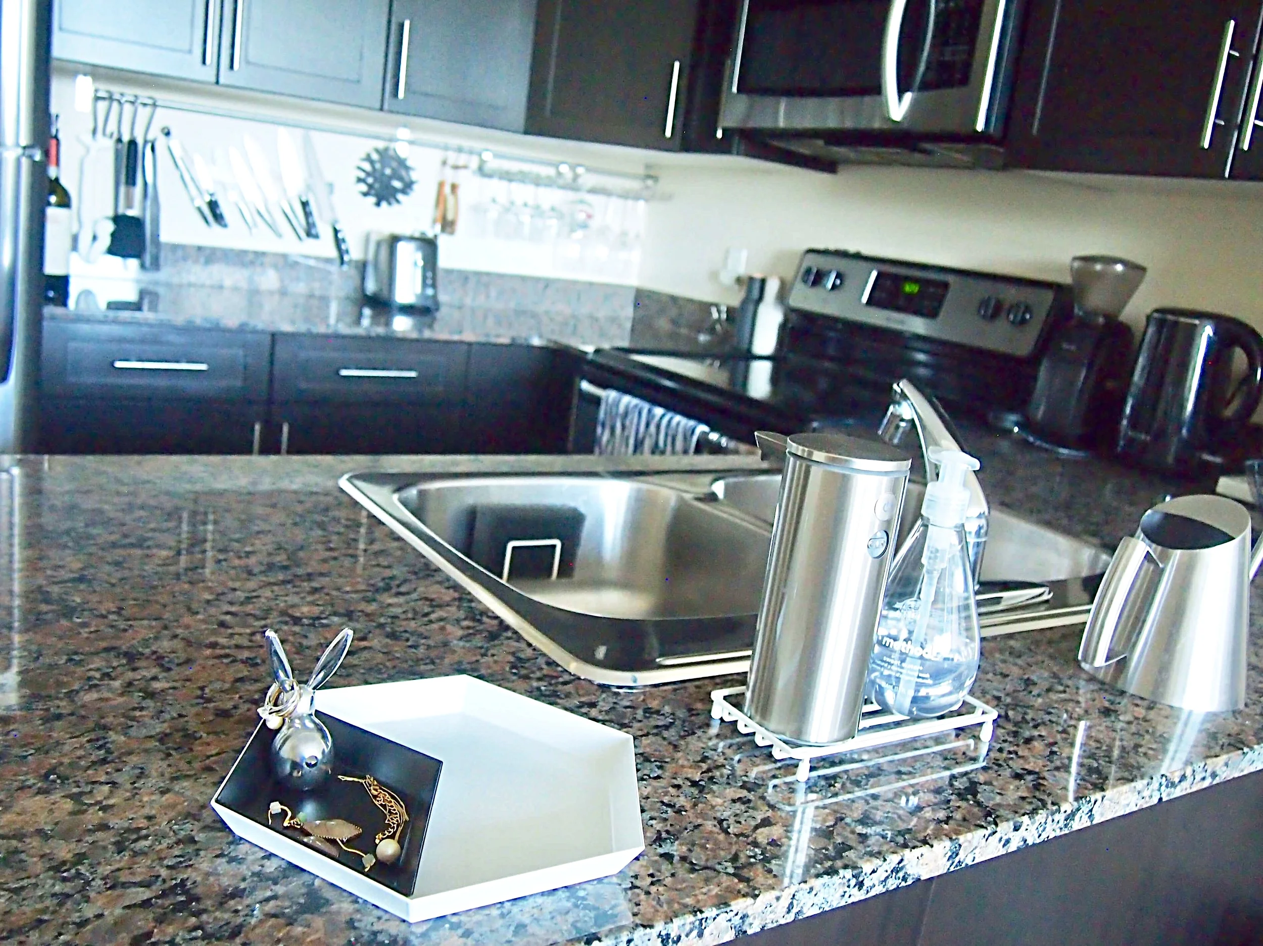 あまりキッチンワークトップにモノは置きたくないけど、狭い我が家ではこういった小物を置くスペースがなし。