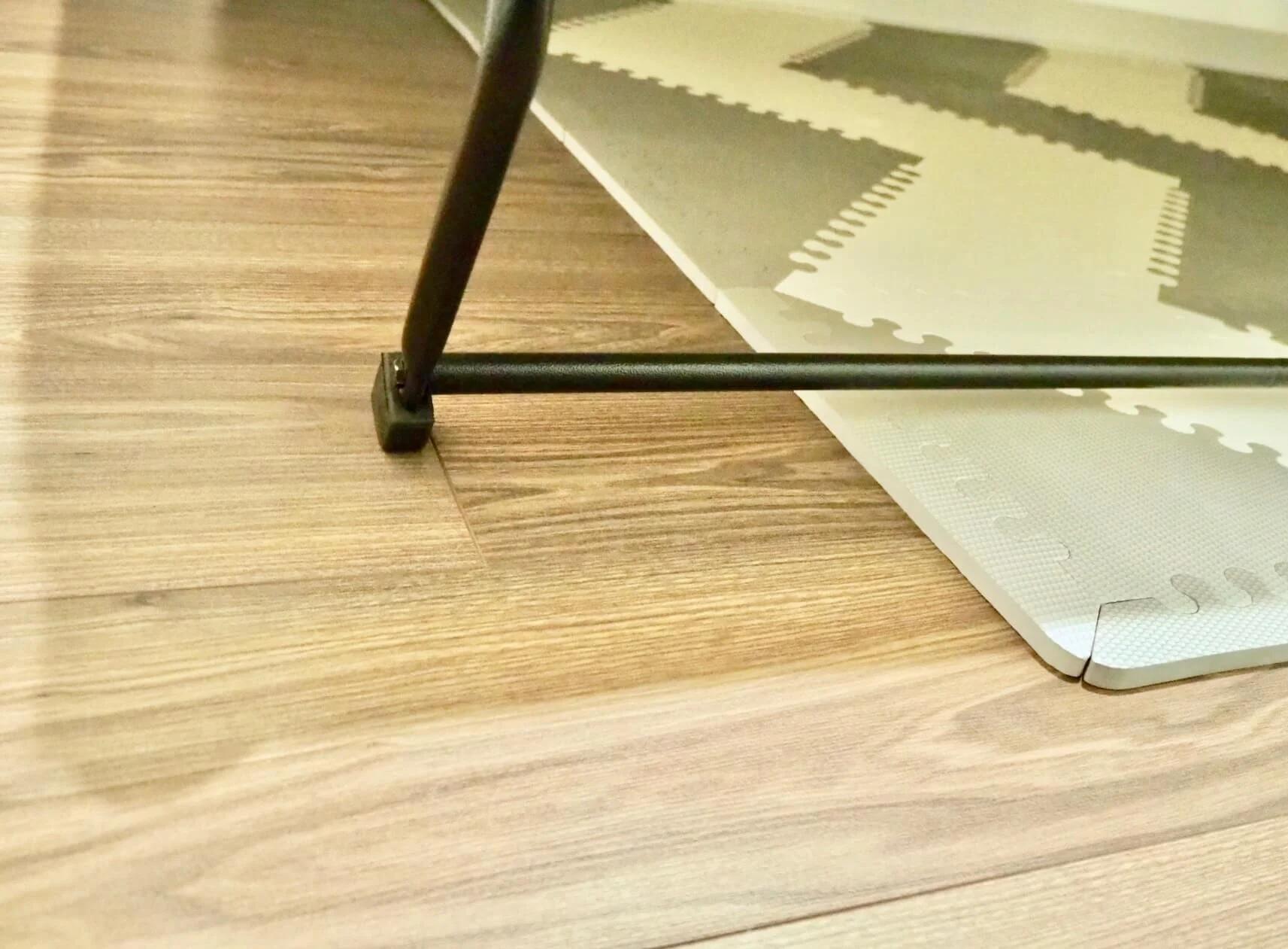 こんな感じでベッドの脚は両端だけが床に付いていて ジョイントマットにかかるポールは床から浮いているので大丈夫!!