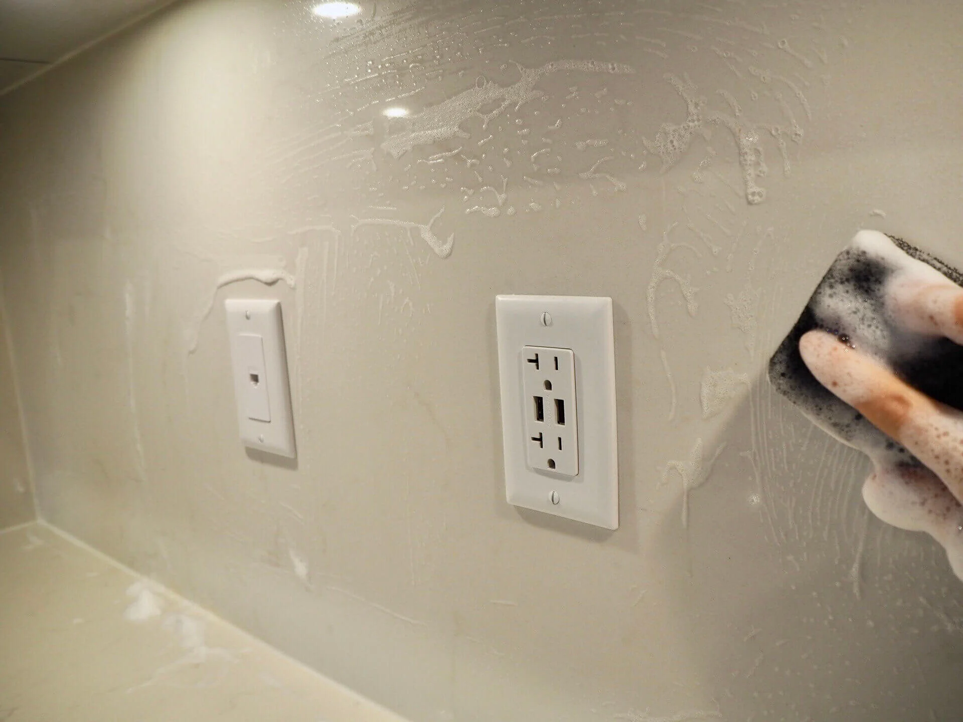 食器洗剤とスポンジで壁とワークトップを丸洗い。