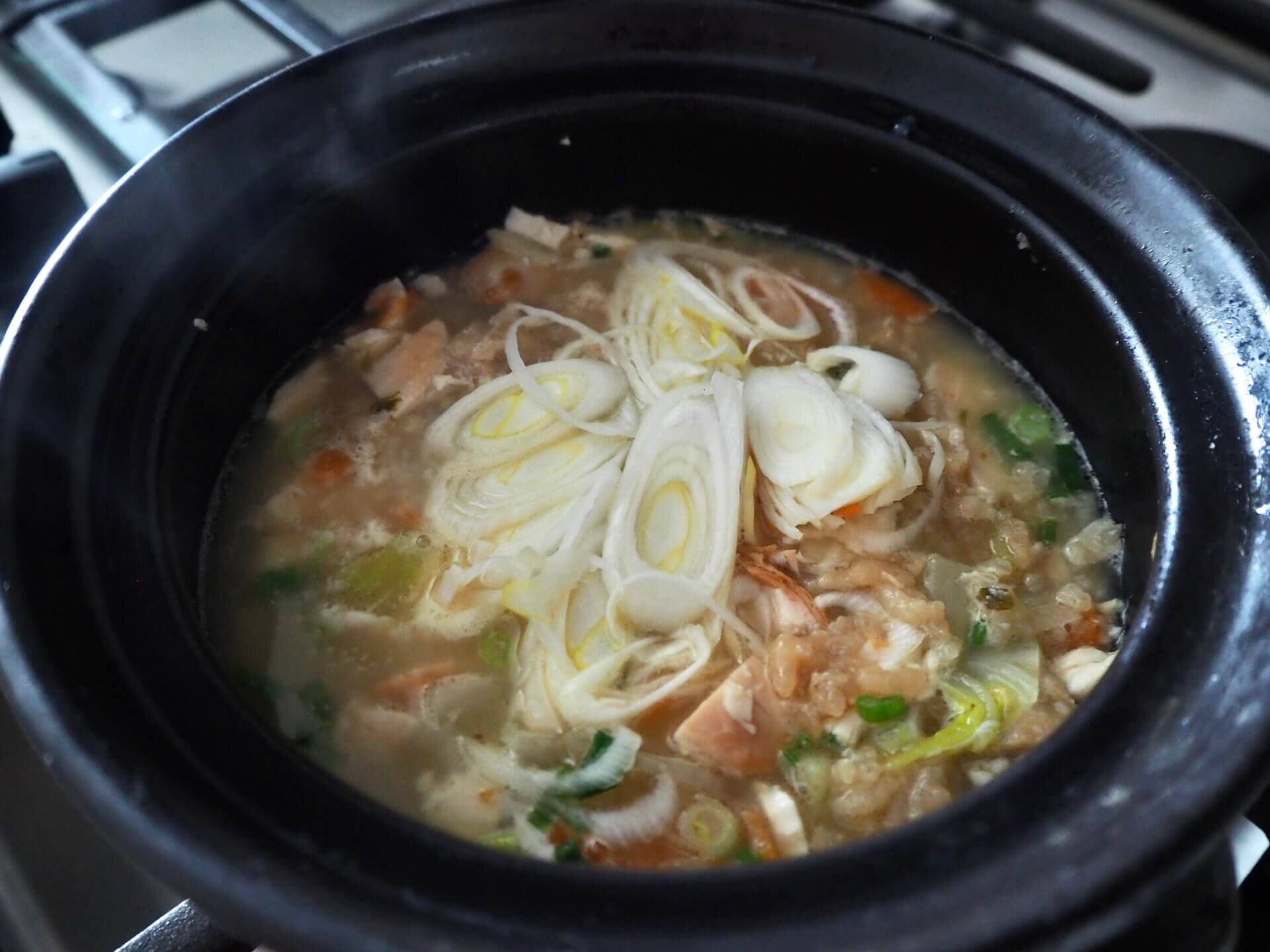 残った骨から鶏ガラスープを作り野菜と残りのチキンも入れて鍋に。