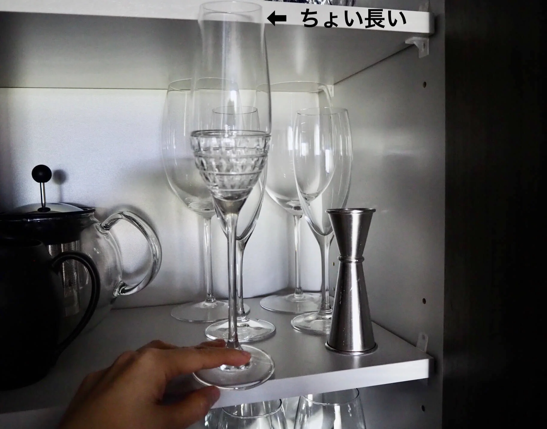 なんでそもそもこのシャンパングラスをオープン棚に置いて見せる収納にしたかと言うと