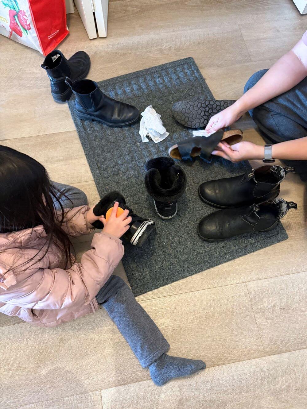 娘も自分のスノーブーツを掃除しだすことに。