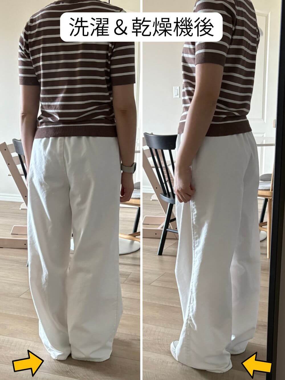 洗濯&乾燥機後の裾丈は1.5㎝縮んだ