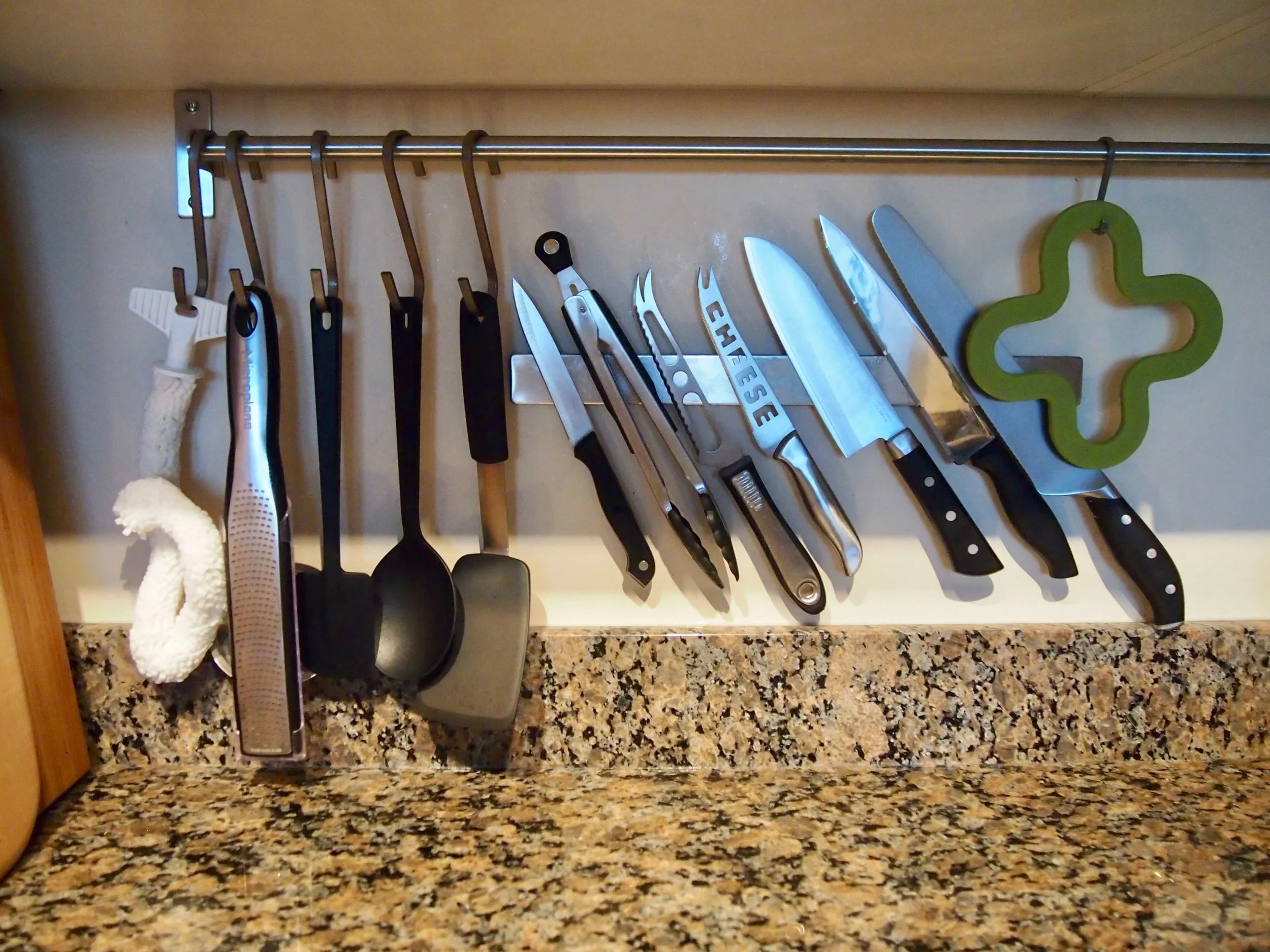 こうやってマグネットのところに包丁と並べ、くっつけて収納をしています。