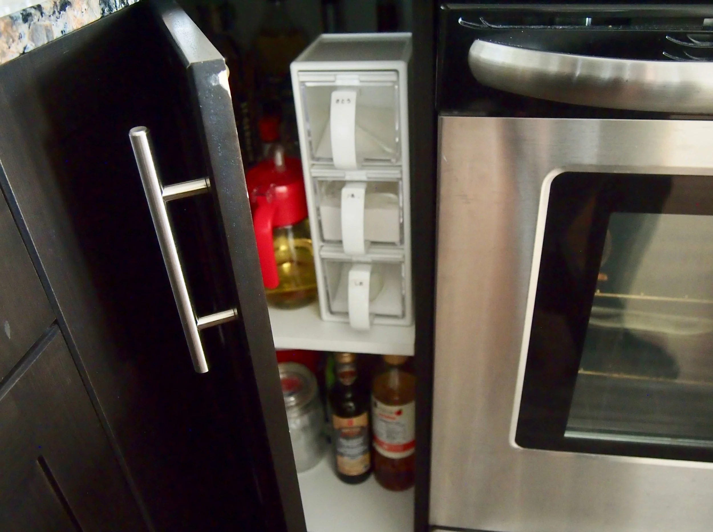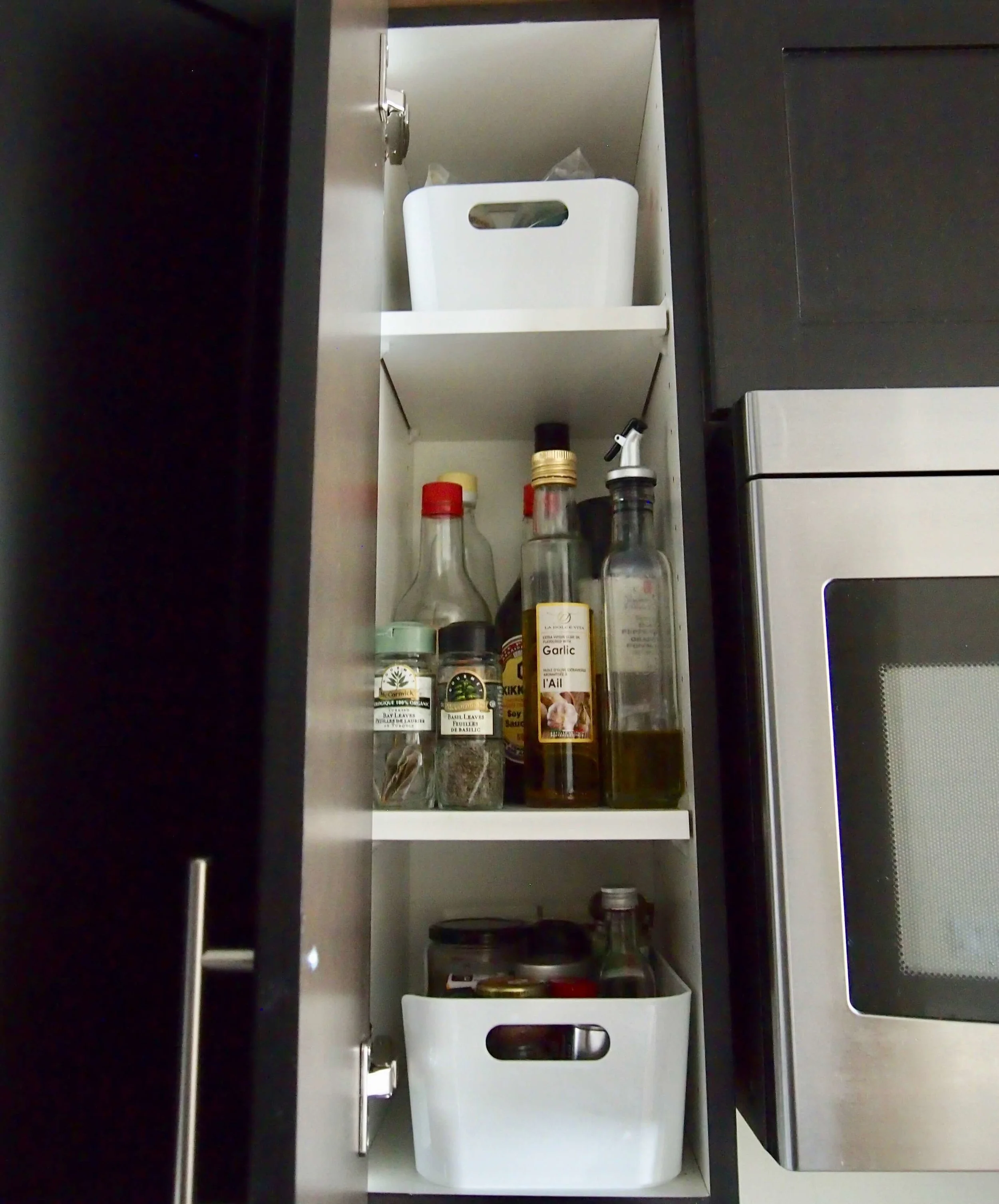 その間に、真ん中の収納棚から調味料ボトルを出してみます。