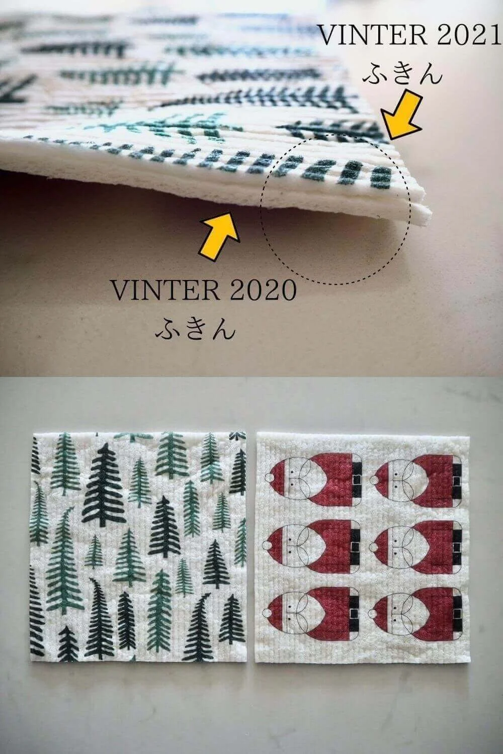 サンタふきん(去年)に比べると木の柄(今年)は若干薄めに感じました。