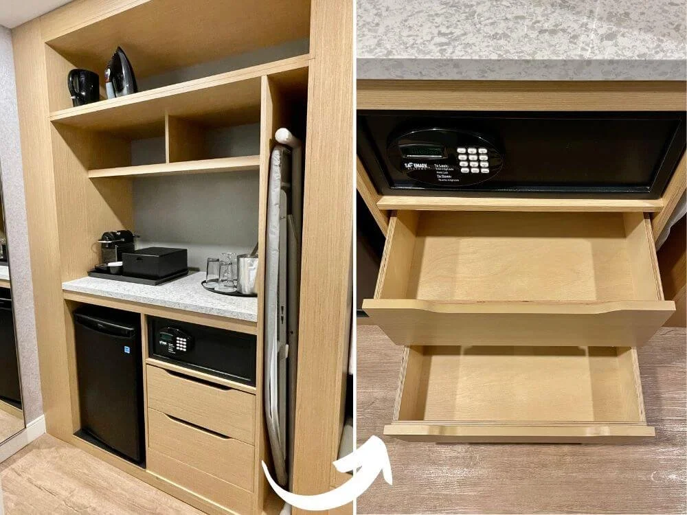 バスルーム前には引き出し収納もあり